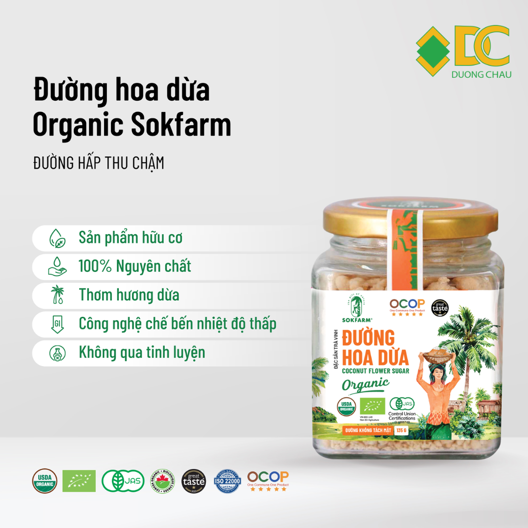 Đường hoa dừa Sokfarm là lựa chọn hàng đầu cho người tiêu dùng theo đuổi lối sống lành mạnh nhờ vị ngọt tự nhiên, chỉ số đường huyết thấp và giàu dưỡng chất từ mật hoa dừa Trà Vinh. Sản phẩm đạt chuẩn hữu cơ quốc tế, sản xuất theo quy trình truyền thống kết hợp công nghệ hiện đại, đảm bảo an toàn – dinh dưỡng – bền vững.