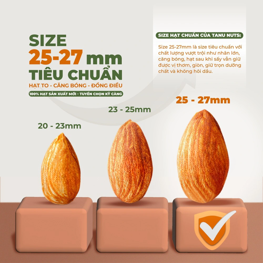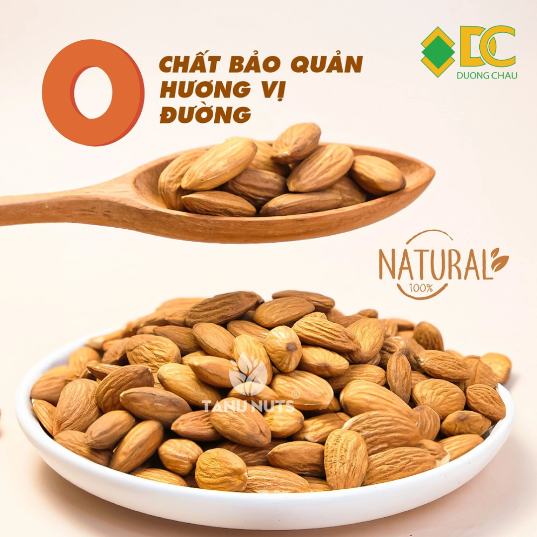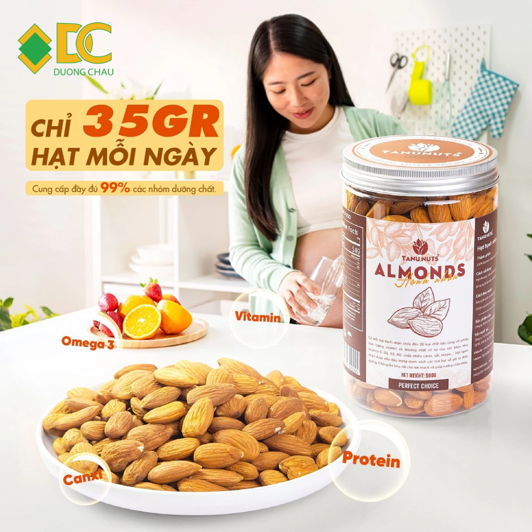 Hạt hạnh nhân Tanu Nuts là loại hạt bổ dưỡng, giàu chất béo lành mạnh, protein, chất xơ, vitamin E và khoáng chất (canxi, magie, kẽm), có nhiều lợi ích cho tim mạch, tiêu hóa, làn da và kiểm soát cân nặng, nhưng cần ăn với lượng vừa phải (khoảng 20-30 hạt/ngày) để tránh nạp quá nhiều calo, và nên chọn loại không muối hoặc ít muối để tối ưu lợi ích sức khỏe. Hạnh nhân có thể dùng trực tiếp, làm sữa, bơ, bột, hoặc trong các món ăn, bánh kẹo khác nhau.