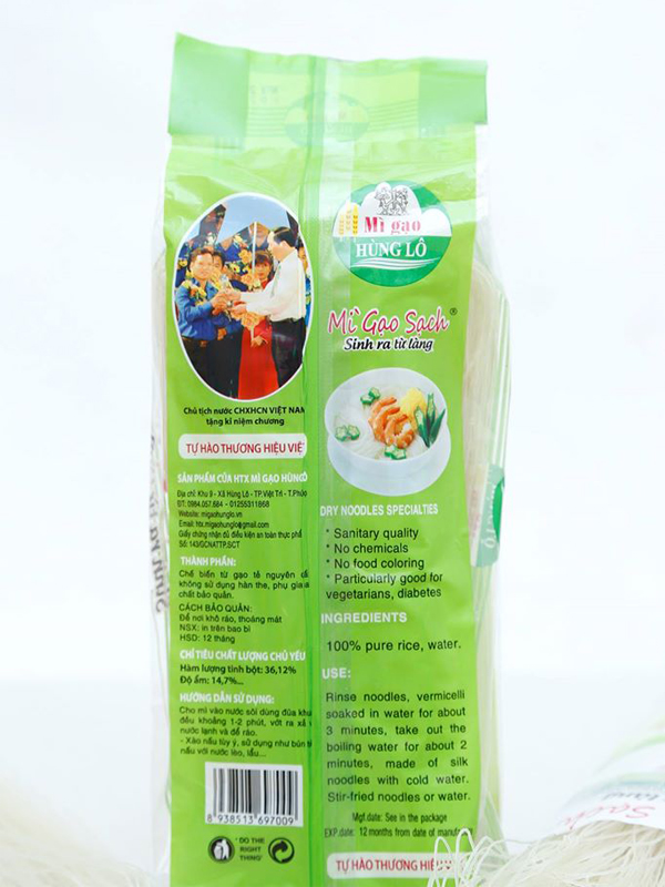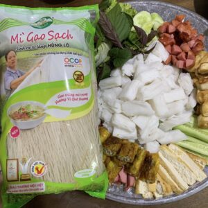 Mì Gạo Sạch Hùng Lô là đặc sản nổi tiếng của vùng đất Hùng Lô, nơi lưu giữ nghề làm mì gạo truyền thống lâu đời. Sản phẩm được làm từ 100% gạo tẻ nguyên chất và nước sạch, không sử dụng hóa chất, chất tẩy, phụ gia hay chất bảo quản, mang đến sự an toàn tuyệt đối cho người tiêu dùng.