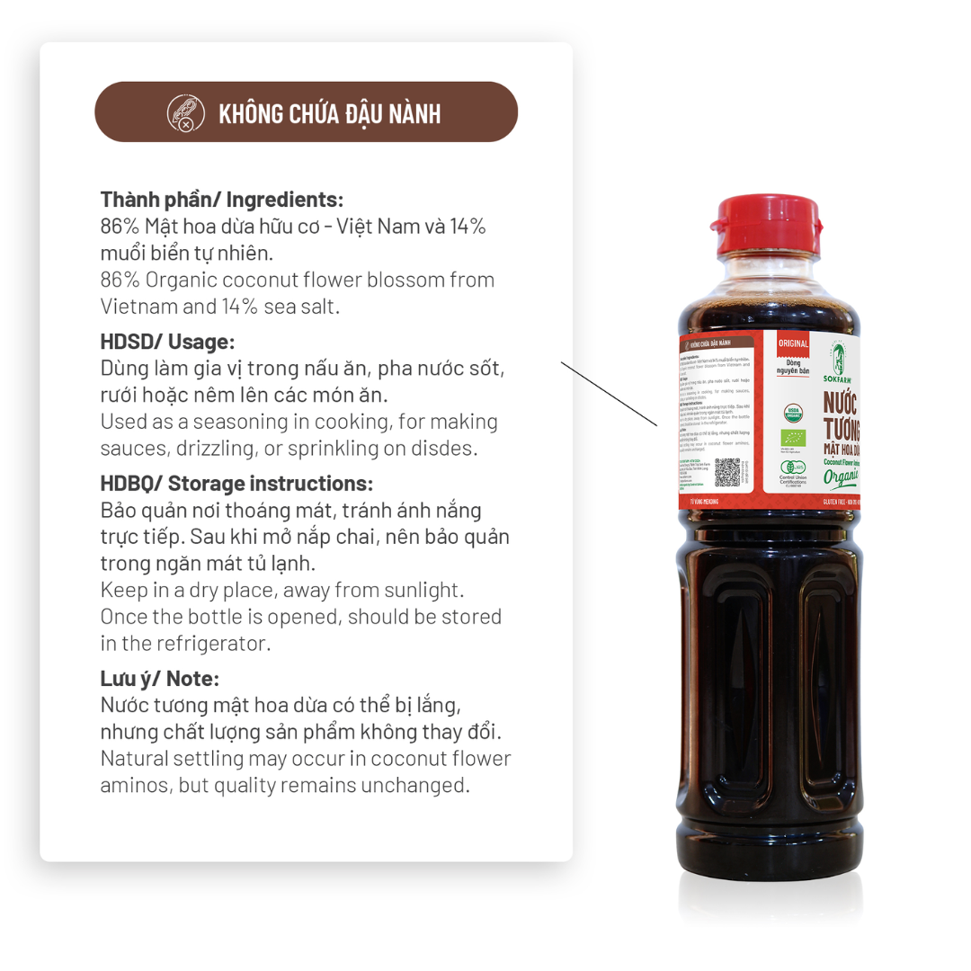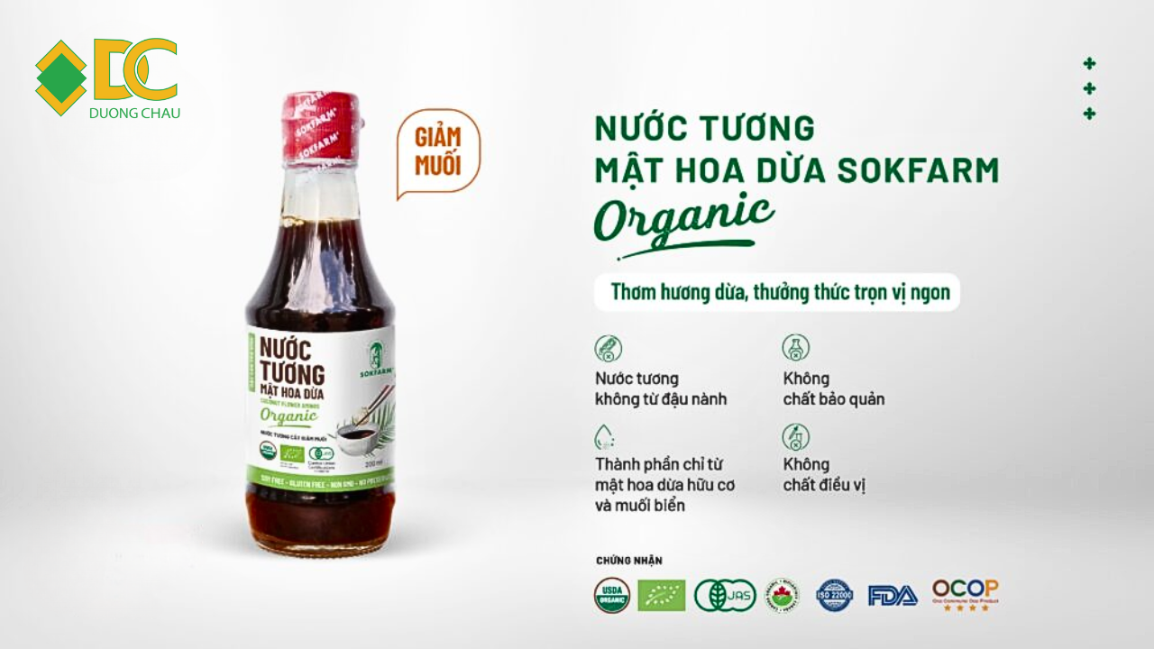 Nước tương mật hoa dừa hữu cơ Sokfarm là dòng nước tương không từ đậu nành – số 1 tại Việt Nam. Sản phẩm được ủ tự nhiên trong 3 tháng, chỉ từ 2 thành phần mật hoa dừa và muối biển tự nhiên. Với các ưu điểm: cắt giảm muối, không chất điều vị, không chất bảo quản, Gluten Free.